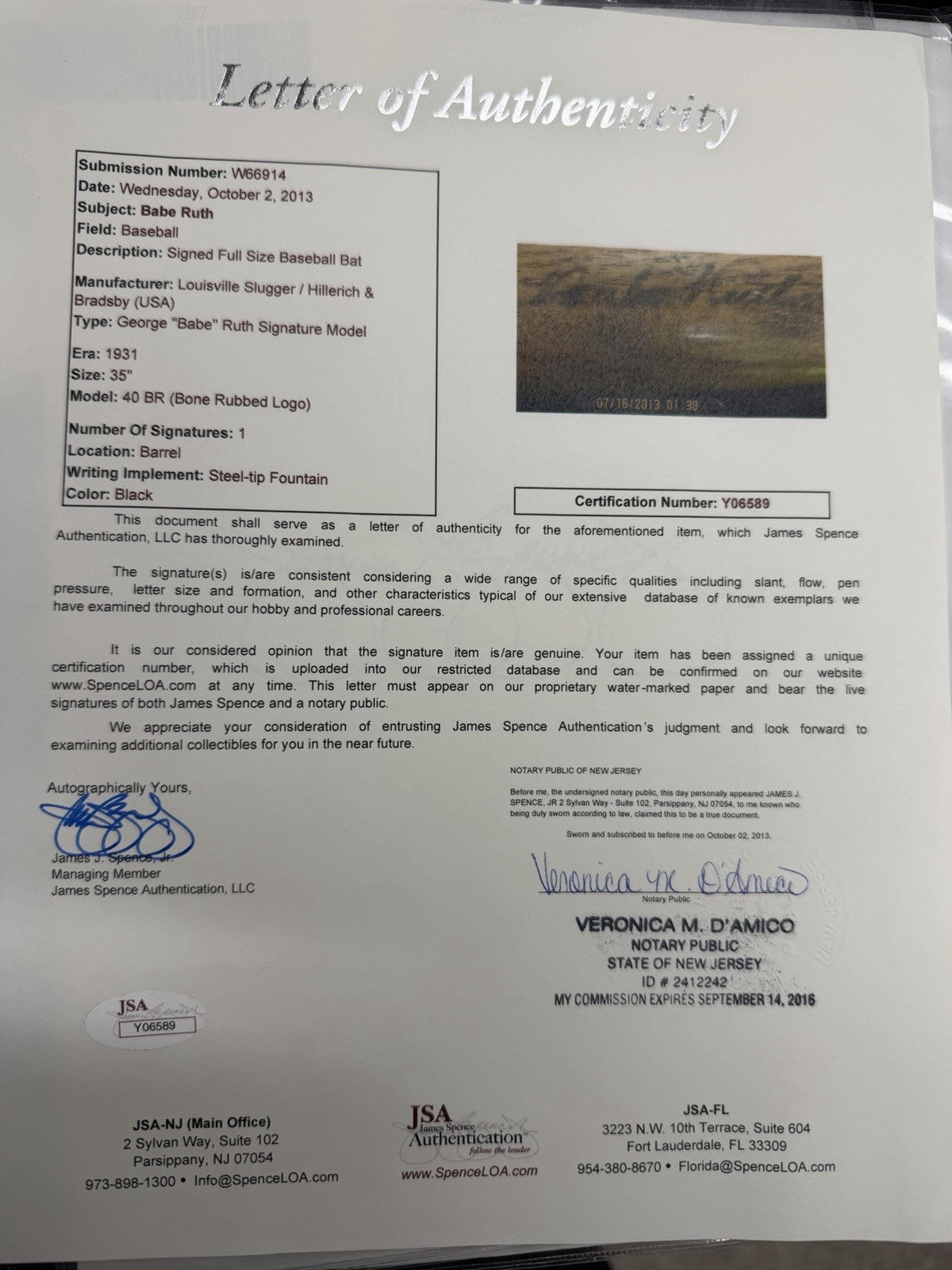 Offered here is a genuinely fascinating 35-inch brown Louisville Slugger 40 B.R. store model Babe Ruth bat bearing a splendid autograph inked by the legend. His immediately recognizable, fountain-penned signature concedes a bit of bleeding into the wood that carries it, but the scripting's sheer power remains undiminished. The 1931-era bat displays "George 'Babe' Ruth" engraved into the barrel between the block-letter trademark and patent stampings; these elements reveal a number of spots where friction has exacted a toll. The H&B logo component is accompanied by a graphic "Bone Rubbed" embellishment to the right and a small, printed notation ("Wills") in an unknown hand to the left. The stick's knob end, where wear is also revealed, bears a 35" stamping. A tiny crack (perhaps repaired) can be seen on the handle. Store model bats like this one were produced to allow enthusiastic children (as well as serious sandlot players) to use bats modeled after those swung in combat by their heroes. In that capacity, the bats earned a certain kind of merit, but almost none achieved this example's deservedly exalted "Babe Ruth Signed" status. This relic stands as a beautiful rendering of the Babe's signature, projecting from the surface of the type of tool that made him famous. LOA from JSA (Y06589) for the signature accompanies.