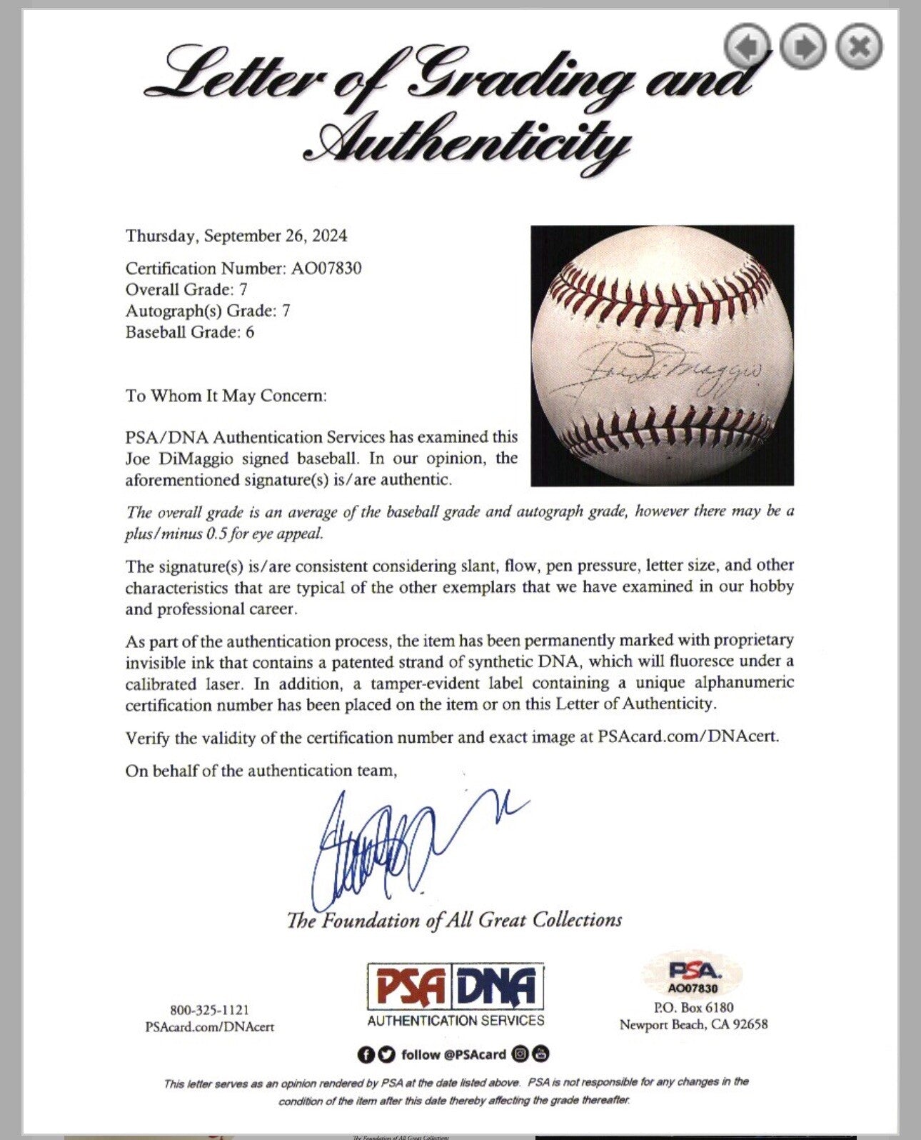 Circa 1941 Joe DiMaggio Single Signed OAL Harridge Baseball PSA/DNA LOA Graded 7. Shipped with USPS Ground Advantage.