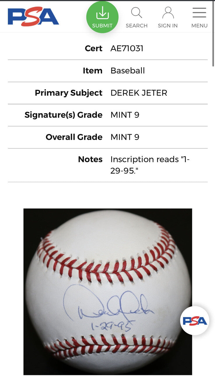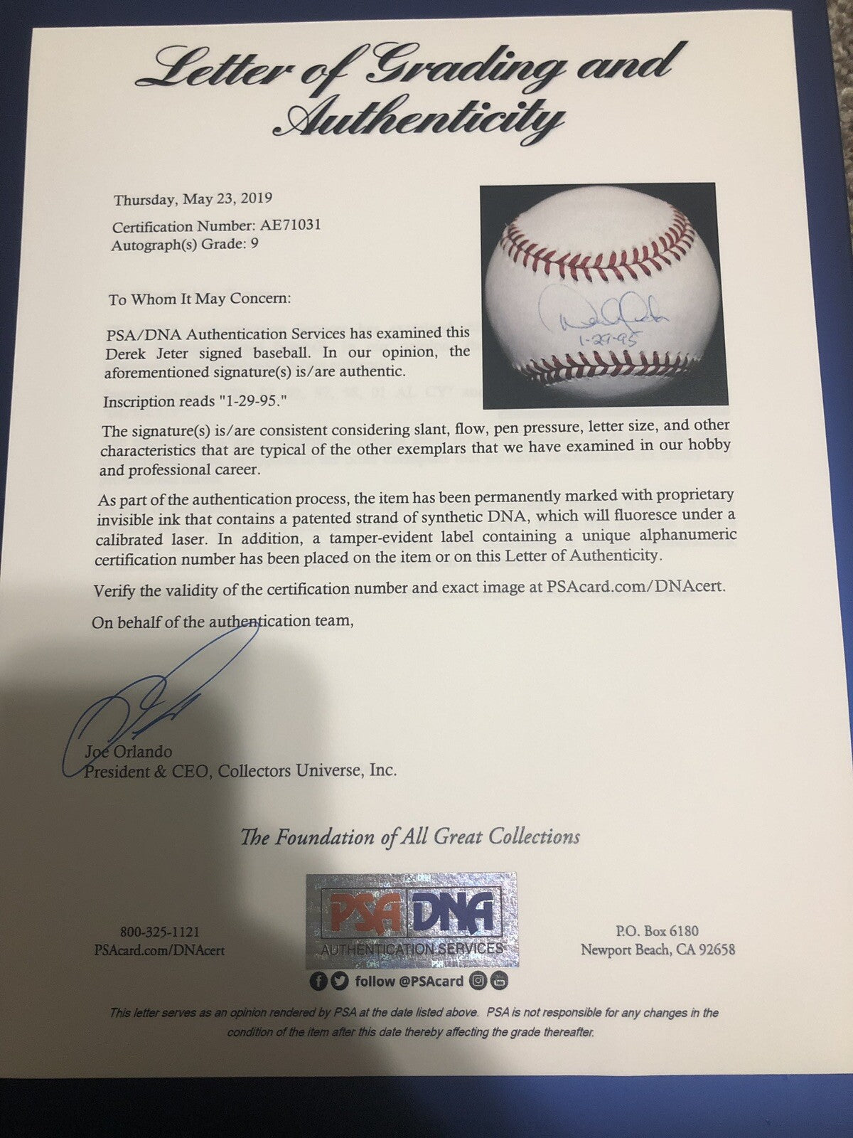 Derek Jeter Signed Rookie Signature Baseball with 1-29-95 inscribed. The ball date inscribed refers to the date he reported to camp in 1995. Ball has been authenticated and graded 9 by PSA/DNA and comes with the PSA LOA.