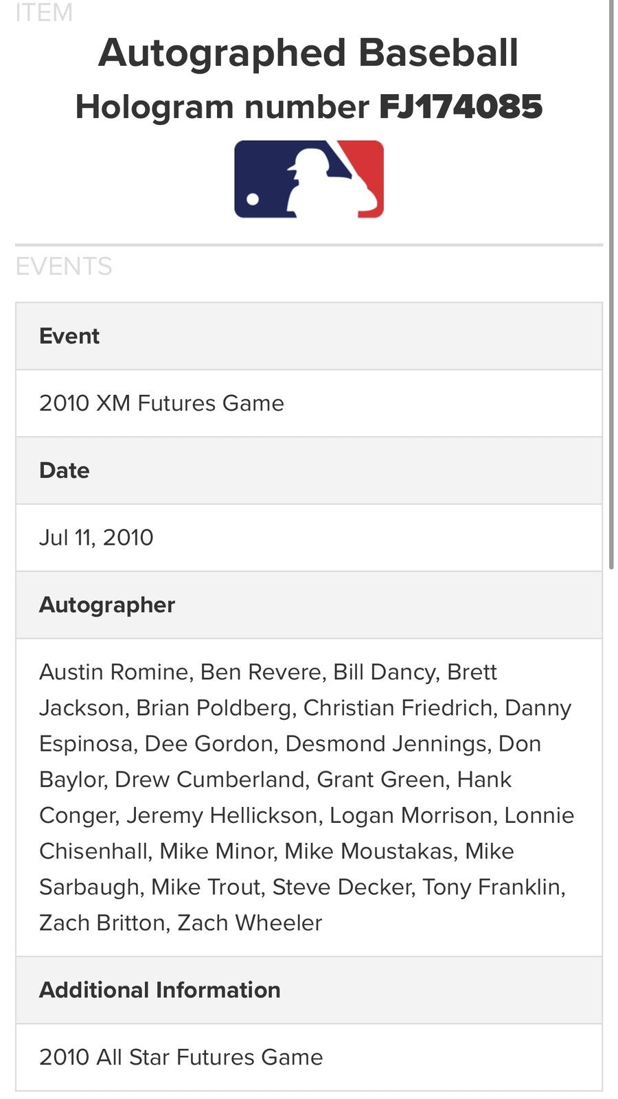 Mike Trout + 23 Members 2010 Future’s Game Team Signed Baseball MLB Holo