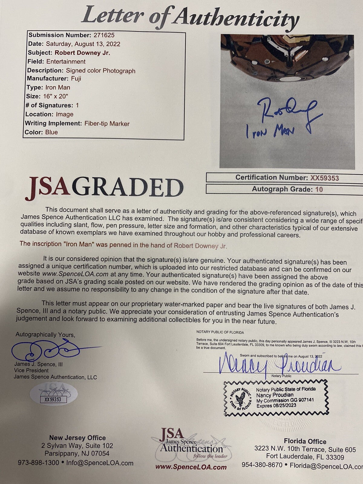 Robert Downey Jr. Signed Iron Man 16x20 Framed Photo SWAU JSA LOA Graded 10
